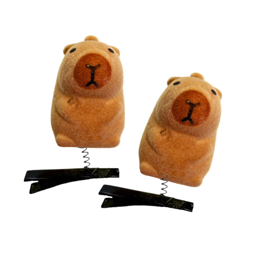 - Efecto de "Capibara Bailarín": Cada figura de capibara está unida a la pinza negra de pelo mediante un pequeño resorte o muelle. Esto hace que la figura se mueva y 'baile' con el movimiento de la cabeza, creando un efecto visual divertido y llamativo.